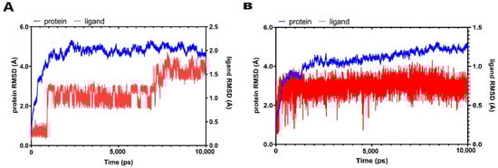 The ligand–protein RMSD plot of compounds 1 and 2 complexed with Mpro of SARS-CoV2: (A) compound 1; (B) compound 2. Left and right Y-axes represent the RMSD values of protein and ligand in molecular distance unit Angstrom (Å). X-axis demonstrates the time in picoseconds (ps).