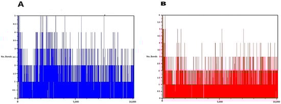 The timeline plot of hydrogen bonding interactions between compounds 1 and 2 and Mpro of SARS-CoV2: (A) compound 1; (B) compound 2. Y-axis represents the number of hydrogen bonds, and X-axis demonstrates the time in picoseconds (ps).