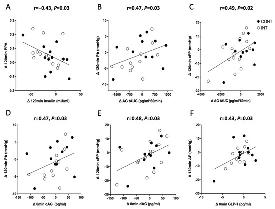 Correlations in fasted and post-prandial gut hormone changes following the intervention. The change (∆) in insulin120min to the ∆ in pulse pressure amplification (PPA)120min (A). The ∆ in acylated-ghrelin (AG) tAUC to the ∆ in backward pressure (Pb)120min (B). The ∆ in AG tAUC to the ∆ in central pulse pressure (cPP)120min (C). The ∆ in fasting des-acylated ghrelin dAG to the ∆ in Pb120min (D). The ∆ in fasting dAG to the ∆ in cPP120min (E). The ∆ in fasting glucagon-like peptide (GLP-1) to the ∆ in augmentation pressure (AP)180min (F).