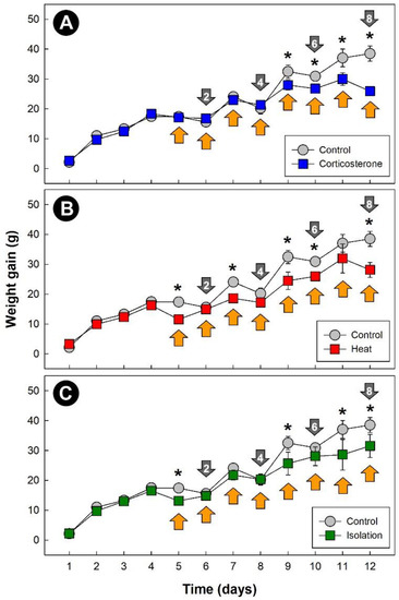 All three stressors temporally affected (p = 0.042) weight gain in chicks relative to control treatment birds (Figure 1A–C). Although the effects (p < 0.050) of stress on weight gain occurred primarily after 5 days of stress treatment, an immediate impact on weight gain due to both heat (Figure 1B) and isolation (Figure 1C) stress was observed.
