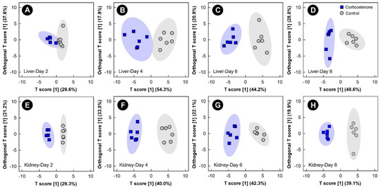 Orthogonal Partial Least Squares Discriminant Analysis (OPLS-DA) score plots of the liver and kidney metabolome of chicks administered corticosterone in their diet, or provided a diet free of glucocorticoid (control treatment), created using the spectral bins that were determined to be altered (p ≤ 0.050) by Variable Importance Analysis, based on random Variable Combination (VIAVC) analysis, and/or the univariate Mann–Whitney U test. (A) Liver at day 2; (B) liver at day 4; (C) liver at day 6; (D) liver at day 8; (E) kidney at day 2; (F) kidney at day 4; (G) kidney at day 6; (H) kidney at day 8. The x- and y-axis in the OPLS-DA plots represent the predictive (between-group separation) and orthogonal (within-group variation) components of the data, respectively. Each marker represents one bird (n = 6 per treatment), and shaded ellipsoids are the 95% confidence intervals for each treatment.