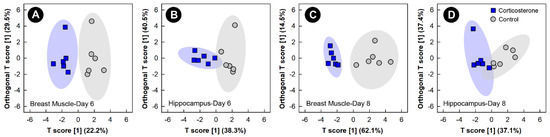 Orthogonal Partial Least Squares Discriminant Analysis (OPLS-DA) score plots of breast muscle and the hippocampus metabolome of chicks administered corticosterone in their diet, or provided a diet free of glucocorticoid (control treatment), created using the spectral bins that were determined to be altered (p ≤ 0.050) by Variable Importance Analysis, based on random Variable Combination (VIAVC) analysis, and/or the univariate Mann–Whitney U test. (A) Breast muscle at day 6; (B) hippocampus at day 6; (C) breast muscle at day 8; and (D) hippocampus at day 8. The x- and y-axis in the OPLS-DA plots represent the predictive (between-group separation) and orthogonal (within-group variation) components of the data, respectively. Each marker represents one bird (n = 6 per treatment), and shaded ellipsoids are the 95% confidence intervals for each treatment.