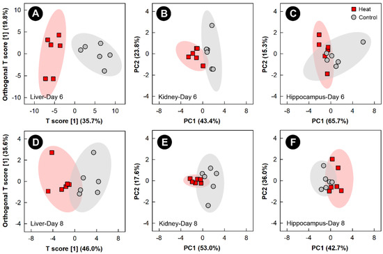 Orthogonal Partial Least Squares Discriminant Analysis (OPLS-DA) score plots of the liver metabolome of chicks exposed to heat stress relative to control chicks, created using the spectral bins which were determined to be altered (p ≤ 0.050) by Variable Importance Analysis, based on random Variable Combination (VIAVC) analysis, and/or the univariate Mann–Whitney U test. (A) Liver at day 6; (D) liver at day 8. The x- and y-axis in the OPLS-DA plots represent the predictive (between-group separation) and orthogonal (within group-variation) components of the data, respectively. Principal component analysis (PCA) score plots of the kidney and hippocampus metabolome of chicks exposed to heat stress relative to control chicks. (B) Kidney at day 6; (C) hippocampus at day 6; (E) kidney at day 8; and (F) hippocampus at day 8. The x- and y-axis of PCA plots show principal components one and two, respectively, with the number in brackets indicating the percent of variance explained by each component. Each marker represents one bird (n = 6 per treatment), and shaded ellipsoids are the 95% confidence intervals for each treatment.