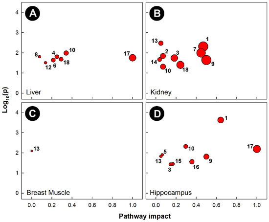 Pathway topologies of tissues from chicks subjected to heat stress. (A) Liver; (B) kidney; (C) breast muscle; and (D) hippocampus. Pathways are: 1, alanine, aspartate, and glutamate metabolism; 2, arginine biosynthesis; 3, arginine and proline metabolism; 4, ascorbate and aldarate metabolism; 5, butanoate metabolism; 6, citrate cycle (TCA cycle); 7, cysteine and methionine metabolism; 8, galactose metabolism; 9, D-glutamine and D-glutamate metabolism; 10, glycine, serine, and threonine metabolism; 11, glycolysis/gluconeogenesis; 12, glyoxylate and dicarboxylate metabolism; 13, histidine metabolism; 14, nicotinate and nicotinamide metabolism; 15, pentose phosphate pathway; 16, phenylalanine metabolism; 17, phenylalanine, tyrosine, and tryptophan biosynthesis; and 18, purine metabolism. See Figure 6 for a description of the analysis tools used.
