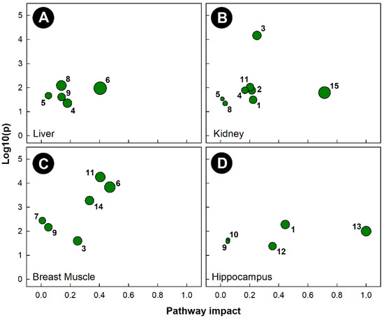 Pathway topology of chicks subjected to heat stress also showed that different pathways were altered in the four tissues examined (Figure 7). Heat stress altered the glycine, serine, and threonine metabolism (KEGG gga00260) pathways in the liver, kidney, and hippocampus. The cysteine and methionine metabolism (KEGG gga00270) pathway was uniquely altered in kidneys, and the butanoate metabolism (KEGG gga00650) pathway was only altered in the hippocampus. Heat stress significantly altered the phenylalanine, tyrosine, and tryptophan biosynthesis (KEGG gga00400) pathways in the liver and hippocampus, the purine metabolism (KEGG gga00230) pathway in the liver and kidney, and both the arginine and proline metabolism (KEGG gga00330) and histidine metabolism (KEGG gga00340) pathways in the kidney and hippocampus. Heat treatment only altered a single pathway in the breast muscle (i.e., glycolysis and gluconeogenesis, KEGG gga00010).