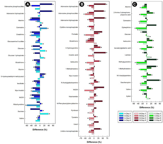 Regulation of common metabolites in the livers of broiler chicks subjected to stressors relative to control treatment at the four experimental endpoints. (A) Corticosterone (blue); (B) heat (red); and (C) isolation (green). Metabolites that were altered (p < 0.050) are indicated by asterisks.
