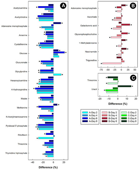 Regulation of common metabolites in the kidneys of broiler chicks subjected to stressors relative to the control treatment at the four experimental endpoints. (A) Corticosterone (blue); (B) heat (red); and (C) isolation (green). Metabolites that were altered (p < 0.050) are indicated by asterisks.