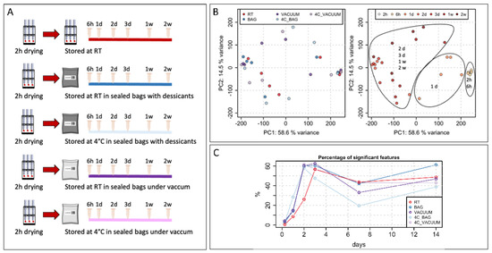 Figure 1. Short-term stability. (A) Experimental design to evaluate short-term stability of VAMS samples. (B) Principal component analysis (PCA) of all features after averaging technical replicates. Samples are colored by different experimental conditions or by time of storage. (C) Percentage of significant features for different storage conditions over time (h: hours; d: days).