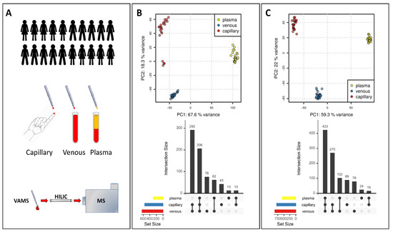 Most metabolomics studies use plasma or serum samples [30], while the analysis of whole blood is less common. However, in the clinical setting, whole blood is commonly used to investigate molecular biomarkers that are important for patient diagnosis, prognosis, and monitoring [31,32]. The usual method for whole blood collection is venous phlebotomy; in addition, blood can be also collected as capillary blood [2,33]. Regarding the metabolomic profile, capillary blood can show a different metabolome compared to the one obtained from venous blood. To evaluate the feasibility of capillary blood as a matrix for metabolomics studies, we designed and conducted a specific study. We recruited 22 healthy participants and collected from each capillary blood, venous blood, and plasma. All samples were collected using VAMS devices, even the phlebotomy-based venous blood sample, to reduce sampling effects.