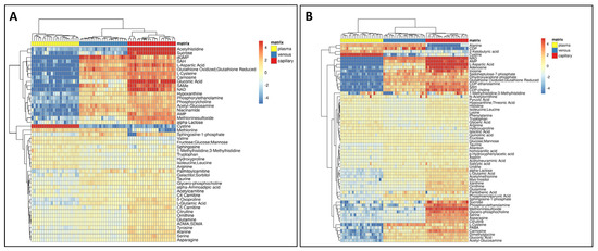 The difference among matrices is not only qualitative regarding the coverage of the metabolome, but also quantitative, as shown in the heat map in Figure 3. We found metabolites that were detected only in capillary and venous blood, such as intracellular metabolites but we also noted that metabolites detected in all matrices had considerably different abundances reflecting differences in metabolite concentrations between the matrices.