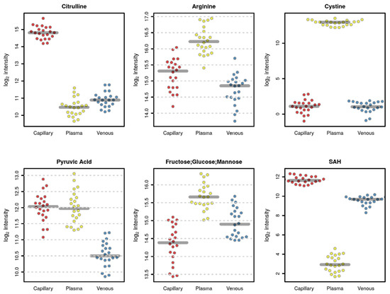 For instance, some metabolites such as S-adenosylhomocysteine (SAH) (Figure 4) and phosphorylcholine and glutathione (data not shown) were mainly detected in venous and capillary blood. Several amino acids showed higher values in plasma, such as cystine and arginine, with some exceptions, such as citrulline which was detected at higher levels in the capillary blood, while valine had a lower abundance in capillary blood (Figure 4). As expected, glucose had higher levels in plasma samples since, inside the cells, it was expected to be rapidly metabolized through glycolysis (Figure 4).