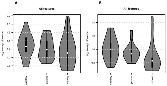 Regarding reproducibility, from the PCA (Figure 2B,C), it seemed that venous samples had the lowest variance between the replicates (i.e., participants’ samples for the same sample matrix), while a larger variation was visible for capillary samples. To evaluate this further, we calculated for each feature the difference in abundance between the two replicated VAMS devices for each participant in each sample matrix. These two VAMS devices per sample represent technical replicates and allow, thus, to evaluate technical differences in the sample collection. Indeed, the average difference of abundances across all features was lowest for venous samples and highest for capillary samples for both positive as well as negative polarity (see Figure 5).