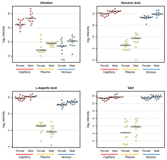 Very few annotated metabolites changed significantly after adjusting for multiple hypothesis testing. Among the significant metabolites was gluconic acid, an intracellular metabolite [23] that showed significantly higher concentrations in male samples both in capillary and venous blood but not in the plasma due to its very low concentration in plasma (Figure 6). Other metabolites such as citrulline, aspartic acid, and SAH all had a raw p-value lower than 0.05, which was, however, no longer significant after adjusting for multiple hypothesis testing. Importantly, however, the trends were similar for all metabolites, with some exceptions for metabolites detected at very low levels in one matrix, such as aspartic acid in the plasma.