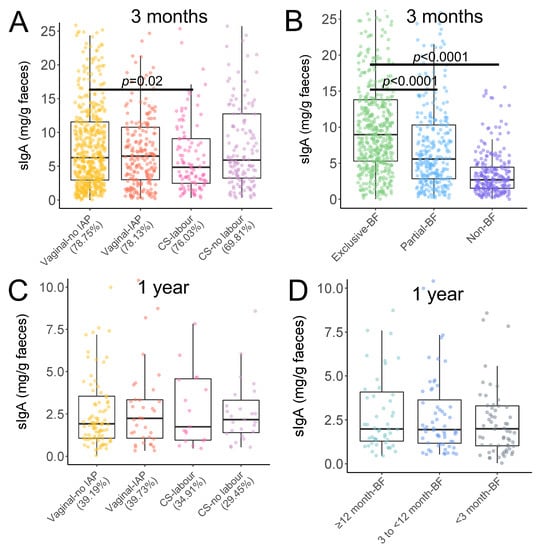 Infants born by CS with labor had a lower fecal SIgA level at 3 months compared to vaginal delivery without IAP exposure (4.85 vs. 6.27 mg/g feces, p < 0.05, Figure 1A); this difference was not observed at 1 year of age (Figure 1C). At 3 months, exclusive breastfeeding was associated with higher levels of SIgA (8.97 mg/g feces) than partial (5.58 mg/g feces, p < 0.0001, Figure 1B) or non-breastfeeding (2.71 mg/g feces, p < 0.0001, Figure 1B).