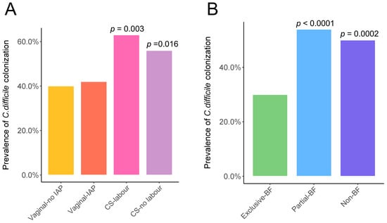 Prevalence of C. difficile colonization according to birth events (A) and breastfeeding exclusivity (B) at 3 months of age. Fisher’s exact tests with vaginal-no IAP or exclusive-BF as the reference group.