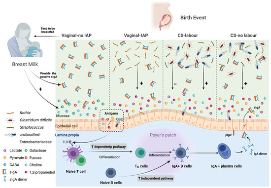 Putative microbe-metabolite mediated pathways from birth event to endogenous SIgA production among infants at 3 months of age, according to sequential mediation analysis, adjusted for gravida status. Compared to vaginal delivery without maternal IAP exposure, CS with labor is associated with lower level of SIgA. Infants born by vaginal delivery without IAP exposure tend to be breastfed and acquire passive SIgA, choline, GABA and lactate from breast milk. Lactate acts as the major putative microbial metabolite that stimulates endogenous SIgA production, via T cell-dependent and T cell-independent pathways. Rothia, Unclassified Enterobacteriaceae, and Streptococcus act independently or jointly with elevated lactate as the putative path for endogenous SIgA stimulation among vaginally delivered infants with IAP or those born by CS. The colonization of Clostridium difficile inhibits SIgA production by decreasing the level of lactate.