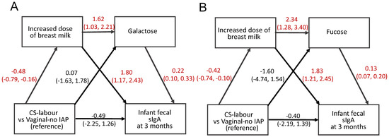 Causal diagram of the association between CS delivery with labor and infant fecal SIgA at 3 months of age, sequentially mediated by increased dose of breast milk, galactose (A) or fucose (B). Vaginal-no IAP is the reference group. Beta-coefficiency with 95% confidence interval of each path exhibits and significant differences (p < 0.05) are indicated in red.