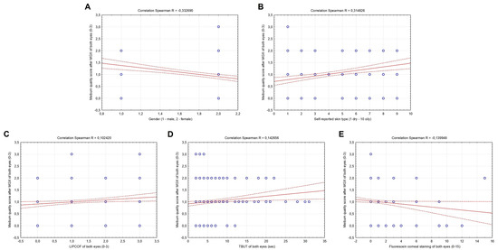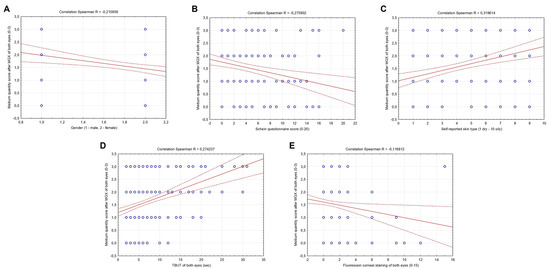 Meibum quality score after MGX of both eyes was also significantly correlated with the female gender (R = −0.332690, p < 0.001), negatively with fluorescein corneal staining score of both eyes (R = −0.139948, p = 0.005), whereas significantly positively with self-reported skin type (1 dry–10 oily) (R = 0.314826, p < 0.001), LIPCOF (R = 0.102420, p = 0.041) and TBUT score of both eyes (R = 0.142656, p = 0.004) (Figure 2A–E). No significant correlation was observed between the meibum quality score A–E and age, the Schein questionnaire score and the CCRLU score of both eyes (p > 0.05) (data not shown).
