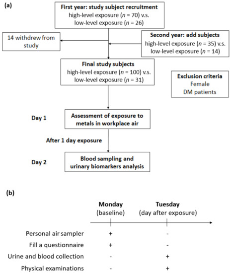 We recruited the study subjects from a shipyard in northern Taiwan, and all qualified subjects were classified into two groups based on their job responsibilities in 2014. At baseline, there were 70 welding workers in the exposure group and 26 office workers in the control group. The following year, earlier participants were recruited and underwent the same study protocols; moreover, we also included new study subjects in both the exposure and control groups. Fourteen subjects withdrew from the follow-up in 2015. Finally, a total of 131 study participants qualified for this study, namely, 100 welding workers and 31 office workers. In all, 82 subjects participated in 2 activities, and 49 subjects participated in one activity. Additionally, we excluded female subjects and individuals with diabetes or those receiving antidiabetic agents, as we intended to eliminate the impacts of sex and metabolism as much as possible. The associated descriptions were illustrated in Figure 1a.