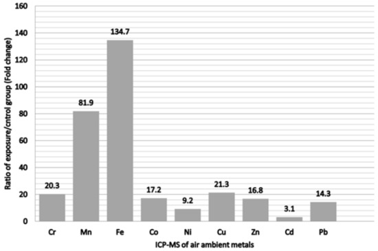 Ratio of metals of exposure/control group from personal air samples in the metal fumes particulate matter.