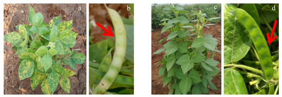 (a) A HgYMV infected plant of highly susceptible horse gram genotype PLS 6194. (b) A HgYMV infected yellow and ill-filled pod (indicated by red arrow) of the highly susceptible horse gram genotype PLS 6194. (c) A plant of highly resistant horse gram genotype PLS 6002 (d) A green and normal pod (indicated by red arrow) of the highly resistant horse gram genotype PLS 6002.