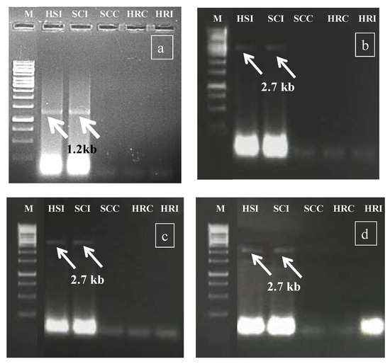 During rabi 2017, in the preliminary screening experiment, the HgYMV infection was validated (Figure 2a) primarily by Rojas primer [30], followed by amplicon sequencing, NCBI blasting, HgYMV-specific primer synthesis, and confirmation (Figure 2b). In the subsequent seasons, the specific primer was used for HgYMV confirmation (kharif 2018: Figure 2c and rabi 208: Figure 2d). Across the experiments, in the susceptible check infected and highly susceptible genotype, an HgYMV-specific amplicon with a size of 2.7 kb was amplified, which was otherwise not amplified in the resistant genotypes (Figure 2c,d).