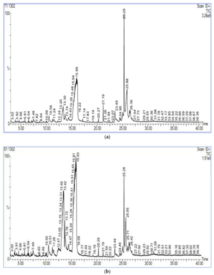 The biochemical compounds present in the crude extract were detected by injecting 1 µL of the samples into a GC injection port (AI3000 II, Thermo Fischer Scientific, Waltham, MA, USA) connected to a GC/MS (TRACE™ GC Ultra with DSQII Quadrupole mass spectrometer (Thermo Fischer Scientific, Waltham, MA, USA). The system is equipped with an Agilent DB-5MS column of 30 m × 0.25 mm × 0.25 µm (length × diameter × film thickness). The carrier gas was helium, and the flow rate was 1 mL/min. Initially, the temperature was maintained at 150 °C with an increasing rate of 4 °C/min and finally elevated to 250 °C with a heating rate and holding time of 5 °C/min and 5 min, respectively. High-energy electrons were utilized in the ionization system under spectroscopic detection in GC/MS.