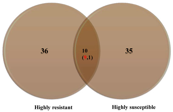 Number of metabolites accumulated in the highly resistant and highly susceptible genotypes. Numbers in the parenthesis indicate upregulated (red) and down-regulated metabolites (black).