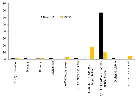 Metabolites such as 2-Ethyl-1-hexanol, Nonanal, Benzene, Melezitose, α-D-Glucopyranose, 3-O-Methyl-d-glucose, 1-Methyl-1-n-octyloxy-1-silacyclobutane, 3,7,11,14,18-Pentaoxa-2,19-disilaeicosane, Diphenyl sulfone, and n-Hexadecanoic acid were commonly expressed in both HR and HS genotypes (Table 5). However, the accumulation level was varied, and the fold increase is presented in Figure 5.