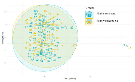 GC-MS data generated from leaf samples of resistant and susceptible genotypes were subjected to PCA analysis using R (https://www.R-project.org/ (accessed on 5 September 2019), R Core Team 2017). The corrected area and fold change were used for the analysis. PermuMatrix software Version 1.9.3 EN (available online at http://www.atgc-montpellier.fr/permutmatrix/) was used for the HCA (accessed on 5 September 2019), and the dissimilarity was measured based on Euclidean distance. The cluster was generated using the UPGMA method and represented as a heatmap.