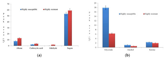 Upon pathogen infestation, plants activate several defense mechanisms to counteract the pathogen’s virulence. These responses upregulate several biomolecules from different metabolic pathways. In HR, enhanced accumulation of sugars, alkanes, and carboxylic acid were observed (Figure 8a).