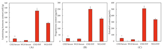 The levels of reproductive hormones in the CH2 and WLS chickens in serum and SYF tissue. (A) LH hormone level, (B) P4 hormone level, (C) E2 hormone level. LH: luteinizing hormone, P4: progesterone, E2: estradiol. * p < 0.05, indicates significance compared to the WLS group. ** p < 0.01, indicates extreme significance compared to the WLS group.