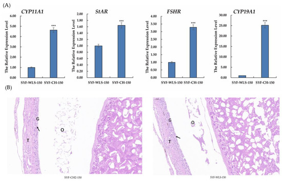 (A) Relative mRNA expression levels of genes associated with sexual maturation in SYF tissue. SYF-WLS-150 represents small yellow follicles of Wu Liang Shan at the age of 150 days. SYF-CH-150 represents small yellow follicles of Cha Hua No. 2. at the age of 150 days. *** p < 0.001 (B) The results of H&E staining, showing the three main parts of SYF. T: thecal cell layer; G: granulosa cell layer; O: oocytes. The figures were imaged at 20× magnification. Arrows point to the granulosa cell layer.