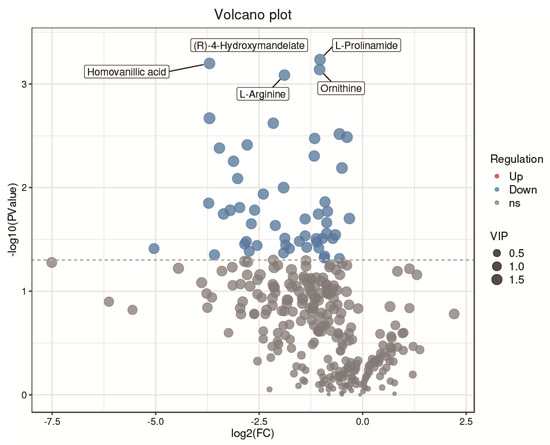 Volcano plot showing the distribution of differential metabolites. Blue represents dow−regulated differential metabolites. Gray represents metabolites that did not meet the filtering parameters. At the top, the names of the five metabolites with the smallest p values are displayed.