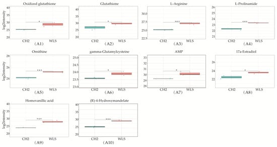 Differentially expressed metabolites in SYF in CH2 and WLS at 150 days. (A1–A10) Ten differential metabolites were identified (p < 0.001 and p < 0.05); (B1–B8) Identified partial differential metabolites that may be associated with sexual maturity, * p < 0.05, indicates significance compared to the WLS group. ** p < 0.01, indicates extreme significance compared to the WLS group. (p < 0.05 and p < 0.01). *** p < 0.001, indicating extreme significance compared to the WLS group.