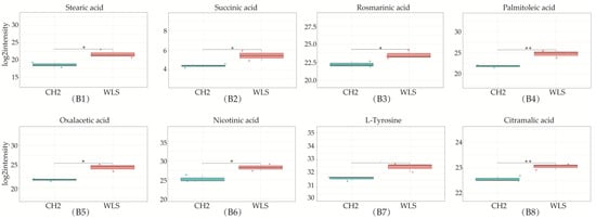 PCA was used to reveal changes in the metabolic profiles of samples under different conditions [41]. As shown in the Figure 3, the PCA score plot showed clear separation between the CH2 and WLS groups. Scattered points corresponding to the samples of the CH2 and WLS groups showed mutual aggregation within each group, indicating a good degree of differentiation between the two groups and good repeatability within each group. The above findings indicated that the samples we selected could be used to explore differentially expressed metabolites based on the results of statistical tests (p < 0.05 and VIP score > 1.0).