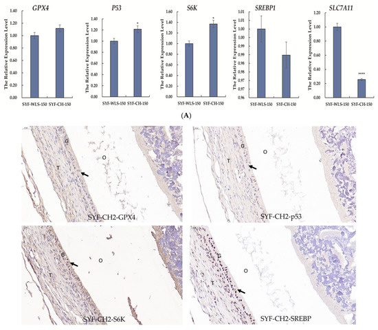 Many differential metabolites and metabolic pathways were found using untargeted metabolomics and were related to oxidative stress. Hence, we speculate that oxidative stress plays a vital role in the development of sexual maturation in chickens. We detected mTOR-signaling-related genes (SREBP1 and S6K). Ferroptosis-signaling-related genes (GPX4, p53, and SLC7A11) were detected in SYF tissue using quantitative real-time PCR technology. As shown in Figure 7A, interestingly, we found that the expression level of SLC7A11 in the CH2 group was significantly lower compared to the WLS group (p < 0.001). The expression levels of the p53 and S6K genes in the CH2 group were significantly higher than those in the WLS group (p < 0.05). The expression levels of the GPX4 and SREBP1 genes had no significant differences between the CH2 and the WLS groups (p > 0.05). It was believed that the “SLC7A11-GSH-GPX4” axis was the primary cellular system for defense against ferroptosis. In our experiment, the expression of the p53 gene in the CH2 group was higher than in the WLS group. p53 inhibits cystine uptake and sensitizes cells to ferroptosis by repressing the expression of SLC7A11. Similar to the mRNA expression pattern, the GPX4, p53, S6K, and SREBP1 proteins were predominantly expressed in the granulosa cell layer of SYF tissues, according to the immunohistochemistry results (Figure 7B). These results suggest that the protein expression levels of GPX4, p53, S6K, and SREBP1 in the granulosa cell layer were upregulated in the CH2 group at the time of sexual maturation. Hence, from the perspective of the expression levels of genes and proteins, our data indicate that the oxidative stress states of Cha Hua No. 2. chickens can be dynamically regulated by the “SLC7A11-GSH-GPX4” axis and can relieve stress from the environment and nutrition so as to maintain the homeostasis of the chicken.