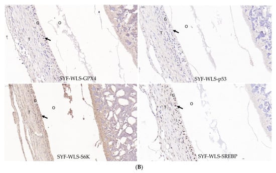 SYF tissue blocks were fixed in 4% paraformaldehyde, dehydrated, embedded in wax, and then cut into 5–6 mm thick sections. The sections were stained with hematoxylin-eosin (H&E). Scanning software was applied to acquire full-field high-resolution digital images of the sections. The images were observed using Case Viewer software. For immunohistochemistry, the sections were put into a 3% hydrogen peroxide solution and incubated at room temperature and away from light for 25 min. The slides were placed in PBS (pH 7.4) and washed three times on a decolorizing shakable bed (5 min each time). The tissue was uniformly covered with 3% BSA in the chemical ring and closed at room temperature for 30 min. The sealing solution was gently shaken off, PBS and a primary antibody were added in a certain proportion to the sections, and the sections were placed flat in a wet box at 4 °C for overnight incubation. The slides were placed in PBS (pH 7.4) and washed 3 times on a decolorizing shaker (5 min each time). After the sections were slightly dried, the secondary antibody of the species corresponding to the primary antibody (HRP labeling) was added to cover the tissue in the ring and incubated at room temperature for 50 min. The sections were placed in PBS (pH 7.4) and washed 3 times on a decolorizing shaker (5 min each time). After the sections were slightly dried, a freshly prepared DAB color-developing solution was added to the circle. The color-developing time was controlled under the microscope. The positive color was brown and yellow, and the sections were washed with tap water to terminate the color development. Hematoxylin was redyed for about 3 min and washed with tap water, and the hematoxylin differentiation solution was differentiated for several seconds and rinsed with tap water. The hematoxylin reverting blue solution reverted to blue and was rinsed with running water. All of the sections were rehydrated through a graded ethanol series and underwent antigen repair, and the results were interpreted under a white light microscope. The main basis for the interpretation of the results was that hematoxylin-stained nuclei were blue and DAB-positive expression was brownish yellow. The details are shown in Table 3.