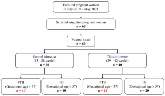 A total of 60 individuals were included in this study, which were classified into second or third trimester, according to the sampling week. After that, PTB and TB were divided based on gestational age. As a result, four groups were determined (Figure 1). (Pregnancy 1st trimester: 1–14 weeks, pregnancy 2nd trimester: 15–28 weeks, and pregnancy 3rd trimester: 29–42 weeks). Characteristics with respect to age body mass index (BMI), and race or ethnicity were similar between the groups (Table S1).