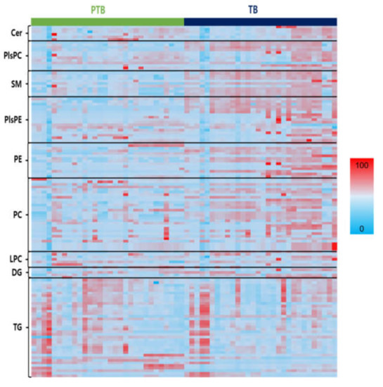 Heats maps representing all lipids between PTB and TB. Normalized expression of each lipid in PTB (n = 30) and TB (n = 30) are shown in scale range from blue to red.