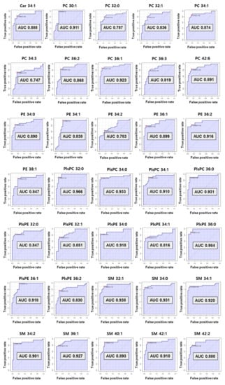 The computed area under the ROC curve with the criteria of AUC ≥ 0.7 was applied to decide on the biomarkers with great diagnostic ability (Figure 5). As a result, preferentially eight SMs (C32:1, 34:0, 34:1, 34:2, 36:1, 40:1, 42:1, and 42:2) and one Cer from sphingolipids were selected as diagnostic biomarkers for preterm birth. Among them, six SMs (C32:1, 34:0, 34:1, 34:2, 36:1, and 42:1) showed perfect accuracy in predicting preterm birth, with an AUC of ROC curve greater than 0.9. Cer 34:1 and two SMs (C40:1 and C42:2) had an AUC greater than 0.8.