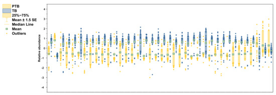Relative abundance of altered lipidomes in CVF. Yellow color in boxplots indicates PTB groups and blue color indicates TB groups. Boxplots contain the range of 25–75%, median line, mean with S.E.M, and outliers.
