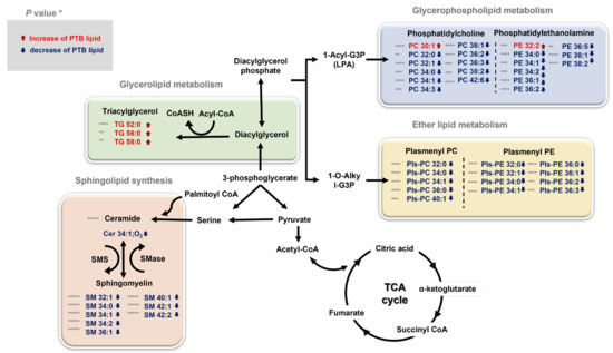 An overview of the integrated metabolic pathways altered by PTB and TB * p < 0.05, ** p < 0.01, *** p < 0.001, and **** p < 0.0001. The significantly changed lipids are indicated by arrows: ↓ downregulated and ↑ upregulated in PTBs. TG triglyceride, PC phosphatidylcholine, PE phosphatidylethanolamine, PlsPC plasmenyl-phosphatidylcholine, PlsPE plasmenyl-phosphatidylethanolamine, SM sphingomyelin, Cer Ceramide, TCA cycle tricarboxylic acid cycle, SMS sphingomyelin synthase, SMase sphingomyelin phosphodiesterase.