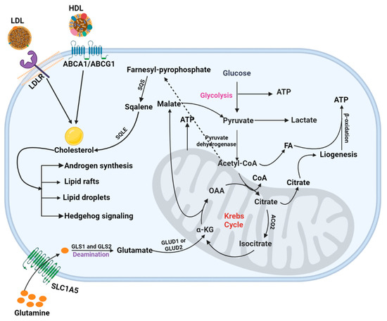 Huang et al. stated that sterol regulatory binding protein 1 (SREBP-1) increases the NADPH oxidase-5 and lipogenesis, which plays a significant role in PCa growth, and metastasis [119]. The lipogenic phenotype of PCa is associated with de novo lipogenesis, and cholesterogenesis is carried out by converting derived citrate from the TCA cycle and oxaloacetate to acetyl-Co-A by ACLY in the cytosol. Acetyl-CoA carboxylase (ACC) converts acetyl-CoA to malonyl-CoA and oxaloacetate into pyruvate, which can re-enter the mitochondria for further utilization. This leads to high activation of de novo lipogenesis and cholesterogenesis. Whereas it has been found that there is increased expression of ACC, ACLY, and FA synthase in PCa [120,121].