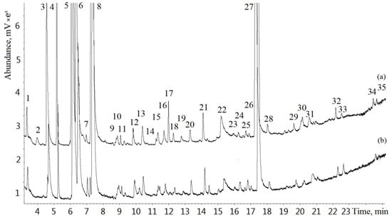 Typical total ion current (TIC) chromatograms of a lung cancer patient (a) and a healthy individual (b): 1—acetaldehyde, 2—isobutene, 3—ethanol, 4—acetonitrile, 5—acetone, 6—2-propanol, 7—ethyl ester, 8—isoprene, 9—2,3-butandione, 10—2-butanone, 11—dimethyl carbonate, 12—hexane, 13—benzene, 14—2-pentanone, 15—allyl methyl sulfide, 16—1-methylthiopropane, 17—1-methylthiopropene, 18—heptane, 19—1-pentanol, 20—toluene, 21—hexanal, 22—N,N-dimethylacetamide, 23—ethylbenzene, 24—o-xylene, 25—2-heptanone, 26—heptanal, 27—phenol, 28—benzaldehyde, 29—octanal, 30—decane, 31—limonene, 32—nonanal, 33—undecane, 34—decanal, 35—dodecane.
