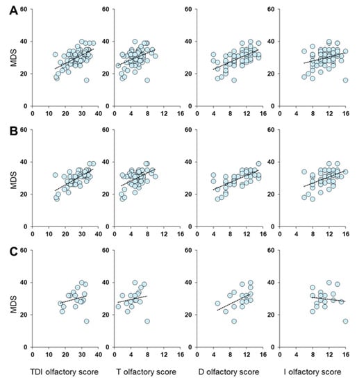 - Hummel, T.; Sekinger, B.; Wolf, S.R.; Pauli, E.; Kobal, G. ’Sniffin’ sticks’: Olfactory performance assessed by the combined testing of odor identification, odor discrimination and olfactory threshold. Chem. Senses 1997, 22, 39–52. [Google Scholar] [CrossRef]