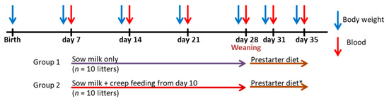 Aside from sow milk, piglets are fed highly palatable and digestible creep feed as early as day 2 of life to ease the transition from liquid to solid feed after weaning. In addition, creep feeding can ensure adequate nutrition when sow milk production cannot adequately meet the needs of her litter which has become more important due to big litter sizes [11]. The chemical composition of creep feed differs from porcine milk, containing a considerable amount of starch and less fat than porcine milk which can be attributed to ingredients like cow dairy by-products, such as whey powder and lactose, plant protein (e.g., soy protein hydrolysate), starches and plant oils. Consequently, if the consumption of creep feed is high enough, creep feed may alter the profiles of metabolites and metabolic markers in blood, which has not been sufficiently described before but may need to be considered especially in relation to routine diagnostics in veterinary practice. Piglets are changed to the cereal-based prestarter diet in the late suckling phase, which is then fed until after weaning, again modulating the intestinally and metabolically available nutrient composition. However, little information is available on whether blood metabolite profiles, when determined during the suckling and early postweaning period, are indicative for the nutrition of the piglets preweaning.