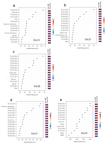 As the next step, biomarker analysis using multivariate ROC curve based exploratory analysis with PLS-DA as classification method was applied to identify marker metabolites for the two nutritional groups for day 14, 21, 28, 31 and 35 of life. Signature feature ranking identified mainly plasma triglycerides as being characteristically different between the two nutritional groups from day 14 to 35 of life (Figure 4a–e), whereas water-soluble metabolites were less represented among the 15 marker metabolites at each day of life. Although triglycerides (TG) were among the top metabolites, the actual TG differed between the two feeding groups on the various days of life. Accordingly, plasma levels of TG 20:4_36:5, TG 17:0_34:2, TG 18:2_38:6 on days 14, 21 and 28 of life, respectively, were indicative for and higher in creep-fed piglets compared to piglets only receiving sow milk (Figure 4a–c). Postweaning, marker analysis showed that TG C17:1_C34:2 and TG C18:0_C32:1 on day 31 and 35 of life, respectively, were indicative for piglets that received sow milk only (Figure 4d,e). From the water-soluble metabolites, it is noteworthy that serotonin was among the top ten metabolites on day 28 of life and two bile acids on day 35 of life; all three metabolites were lower in creep fed piglets compared to piglets that were fed only sow milk during the suckling piglets.
