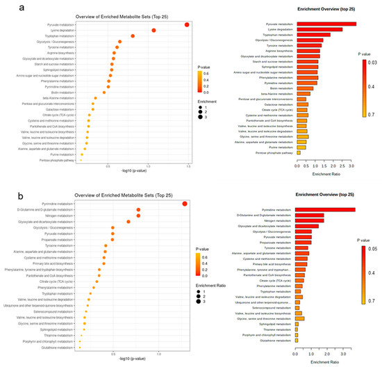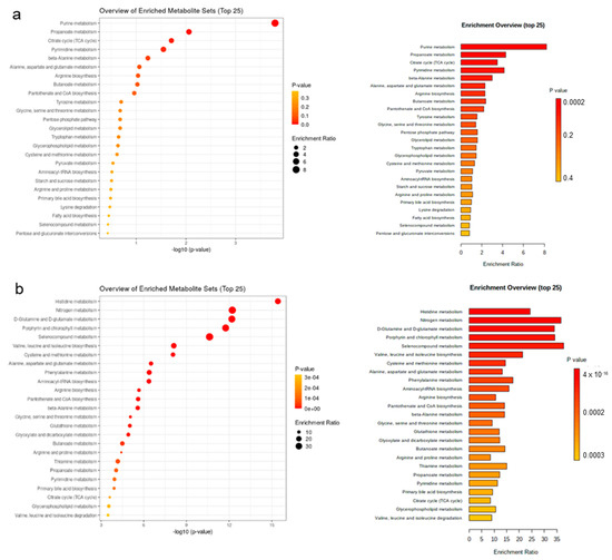 Enriched pathways (top 25) in discriminant plasma metabolites for sparse partial least squares-discriminant analysis. Pathway analysis used the KEGG Pathway Database for Homo sapiens as a reference pathway library because no respective database was available for Sus scrofa. Most discriminant pathways for (a) day 7 versus day 14 of life; and (b) suckling versus postweaning period. Piglets were weaned on day 28 of life.