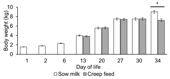 Body weight development of the piglets showed similar growth between the two feeding groups during the suckling phase, whereas on day 34 of life piglets that received creep feed during the suckling phase weighed 1.8 kg less than the piglets that only suckled sow milk during the suckling phase (p = 0.005; Figure 7).